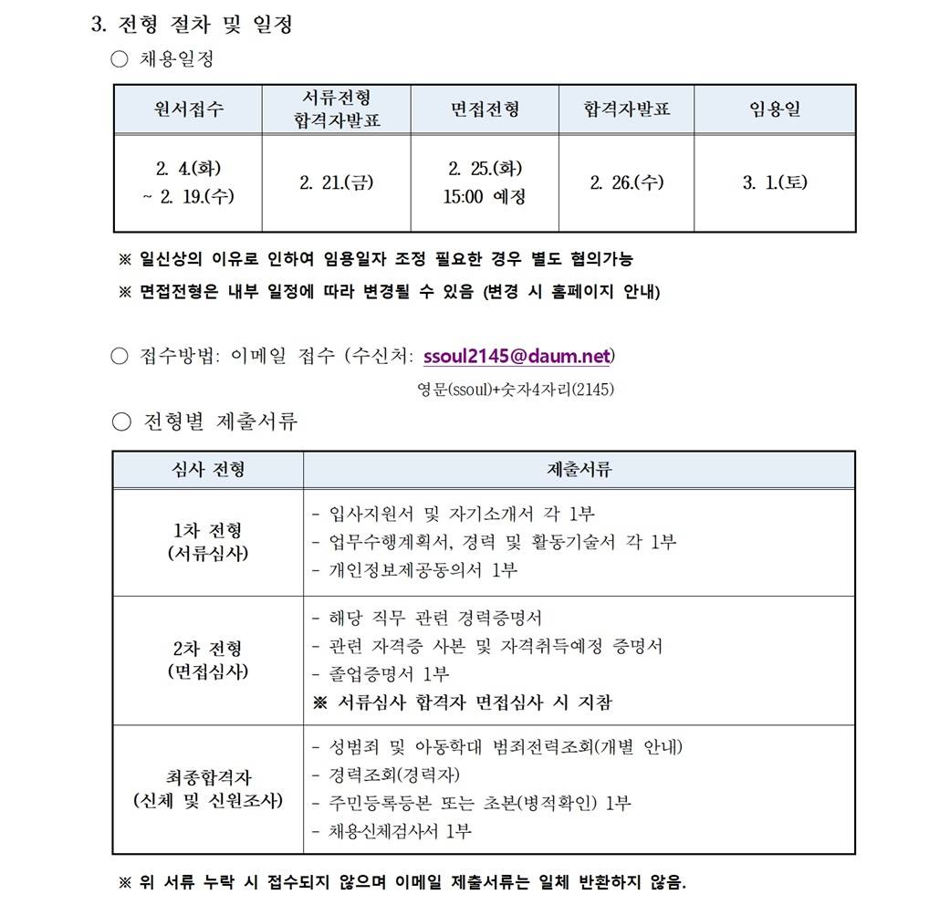- 자사홈페이지(https://ssoul.org)의 채용공고내 지원서식 작성 후 제출