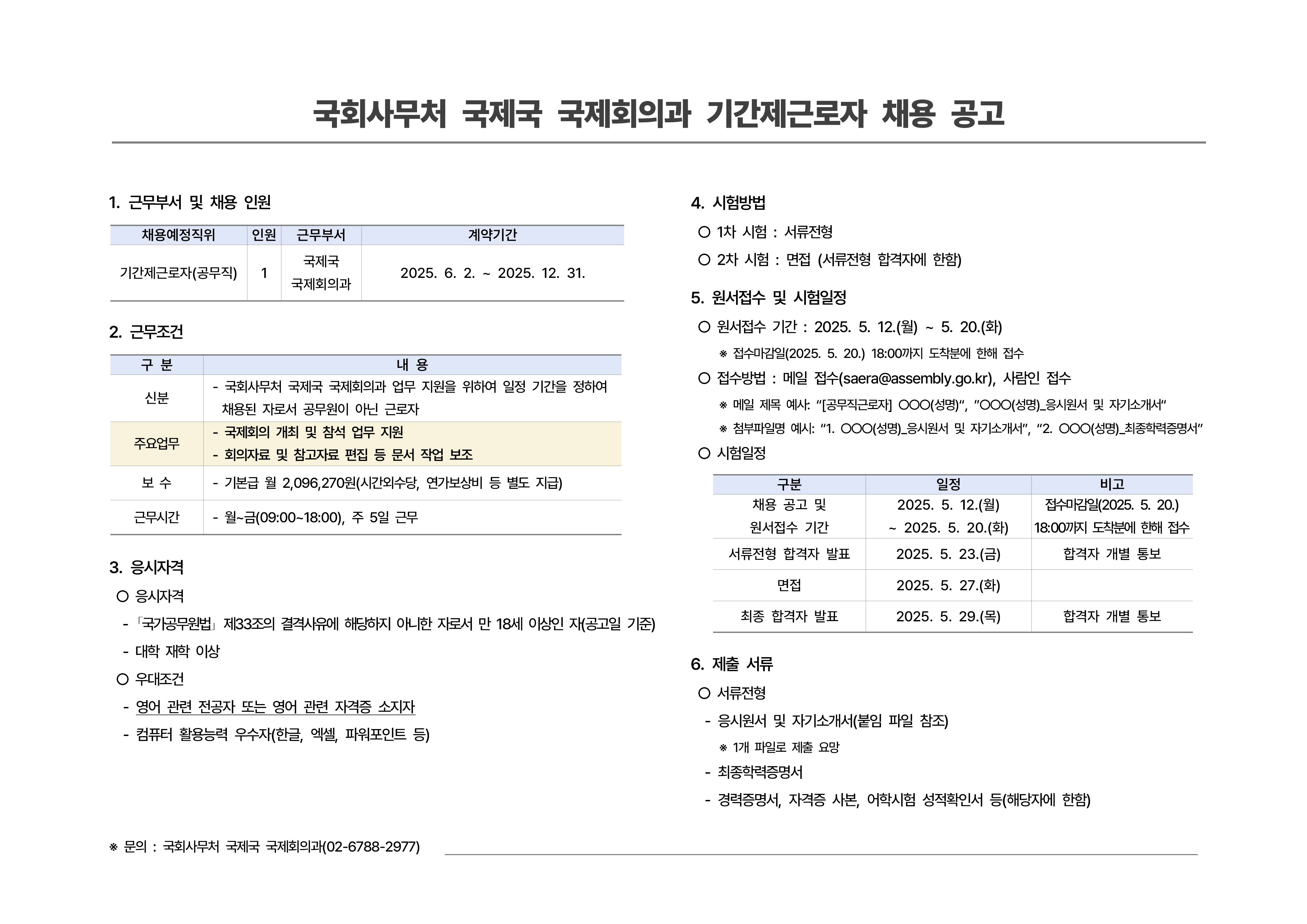 | 국회사무처 국제국 국제회의과 인턴 채용 (1명) | 인턴(6개월) 팀원 | 담당업무 - 국제회의 개최 및 참석 업무 지원 - 회의자료 및 참고자료 편집 등 문서작업 보조 ※ 첨부된 채용공고문 필수 확인 ※ 첨부된 응시원서 및 자기소개서 양식 필수 확인 | - 영어 관련 전공자 또는 영어 관련 자격증 소지자 - 컴퓨터 활용능력 우수자(한글, 엑셀, 파워포인트 등) |
