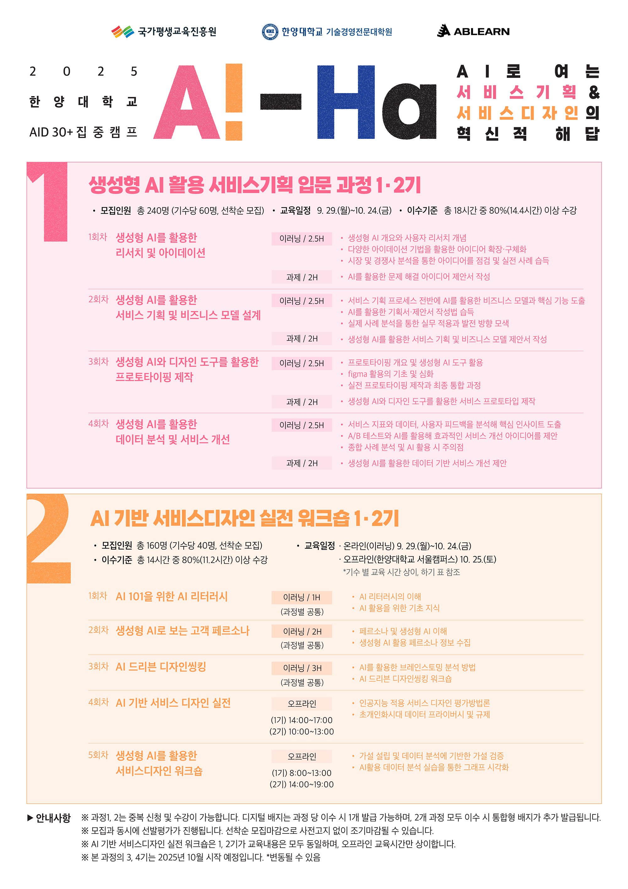 AI 기반 서비스 디자인 실전 워크숍 1, 2기: 온라인 9. 29.(월)~10. 24.(금) / 오프라인 10. 25.(토)