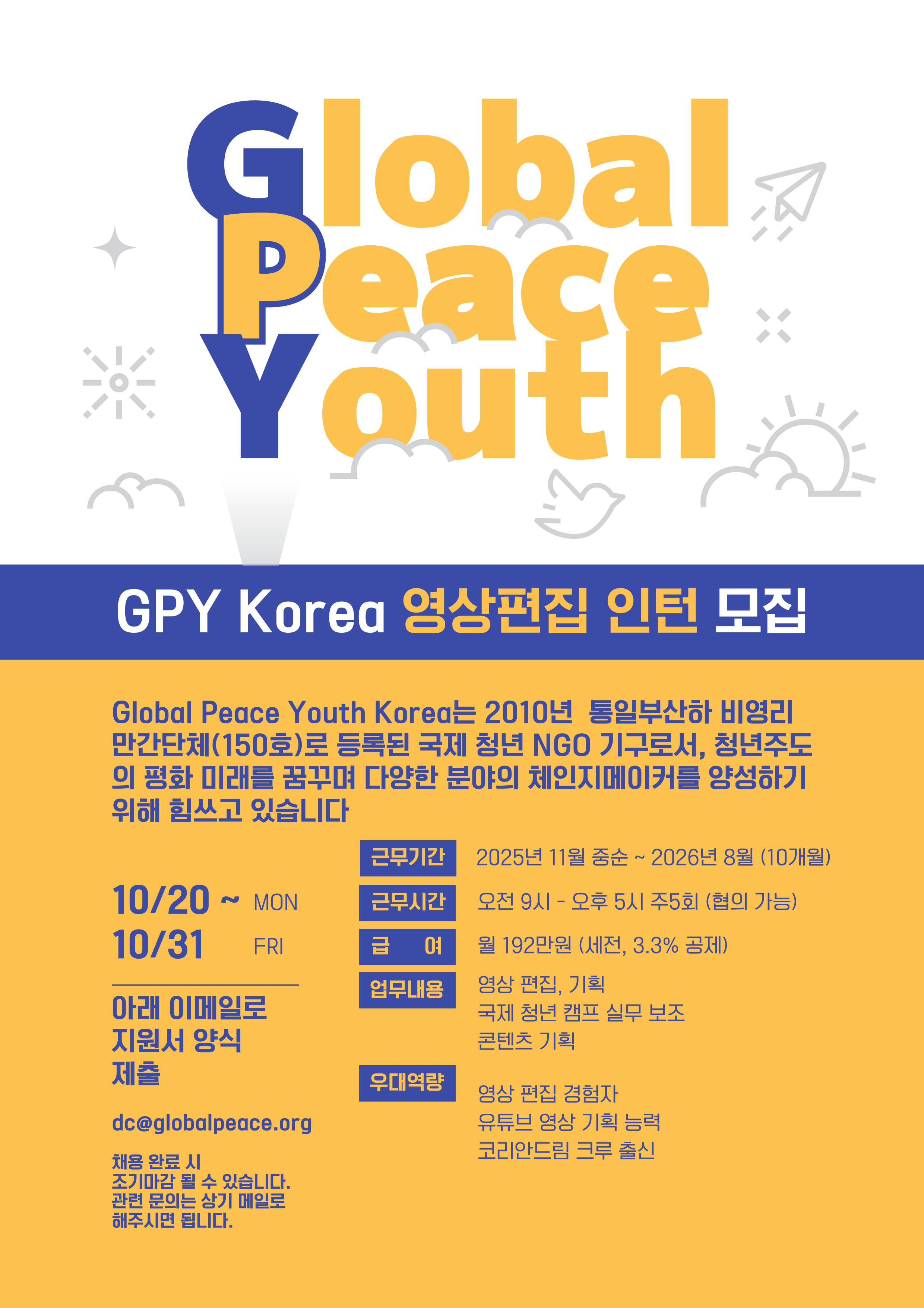 GPY Korea에서 국제협력 및 글로벌 콘텐츠 제작에 관심 있는 대학생 인턴을 모집합니다.