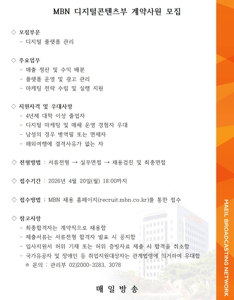 방송사 소유 디지털 플랫폼 운영 관리 및 디지털 매출 관리 업무입니다.